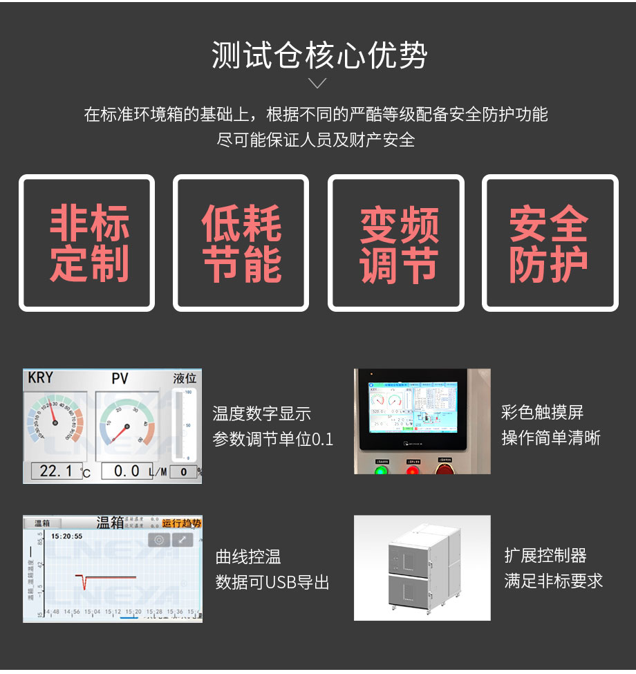 798電池環(huán)境試驗箱是專門針對不同型號電池測試需要,在標準環(huán)境箱的基礎(chǔ)上,根據(jù)不同的嚴酷等級配備安全防護功能,最大程度保證人員及財產(chǎn)安全;變頻自定算法控制,機組運行綜合節(jié)能35%以上。 ,