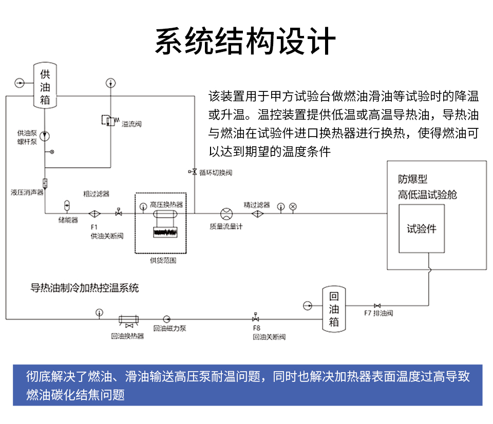 該裝置用于為甲方試驗(yàn)臺做燃油、滑油等試驗(yàn)時的燃油、滑油降溫或升溫。導(dǎo)熱油制冷加熱裝置提供低溫或高溫導(dǎo)熱油,導(dǎo)熱油與燃油在試驗(yàn)件進(jìn)口換熱器進(jìn)行換熱,使得燃油可以達(dá)到期望的溫度條件,原理示意如圖1所示。
