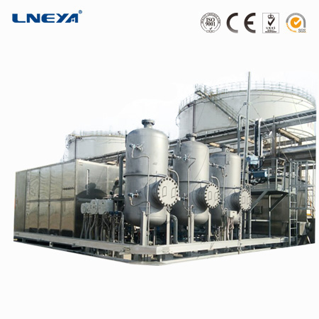設(shè)備采用壓縮機(jī)制冷-制冷系統(tǒng)工作時(shí)由壓縮機(jī)排出的高溫高壓制冷劑氣體進(jìn)入冷凝器被冷凝成高壓過(guò)冷液體,經(jīng)膨脹閥節(jié)流降壓變成低溫低壓的汽液兩相混和物進(jìn)入蒸發(fā)器(一級(jí)換熱器、二級(jí)換熱器、三級(jí)換熱器),制冷劑在其內(nèi)吸收通過(guò)蒸發(fā)器的導(dǎo)熱介質(zhì)的熱量進(jìn)行自身氣化,制冷劑充分氣化后再被壓縮機(jī)吸入壓縮室進(jìn)入下一輪循環(huán)。導(dǎo)熱介質(zhì)通過(guò)循環(huán)泵輸送到氣體冷凝冷箱與氣體進(jìn)行換熱。整機(jī)系統(tǒng)通過(guò)以上過(guò)程不斷循環(huán),從而達(dá)到氣體連續(xù)降溫液化回收的目的。